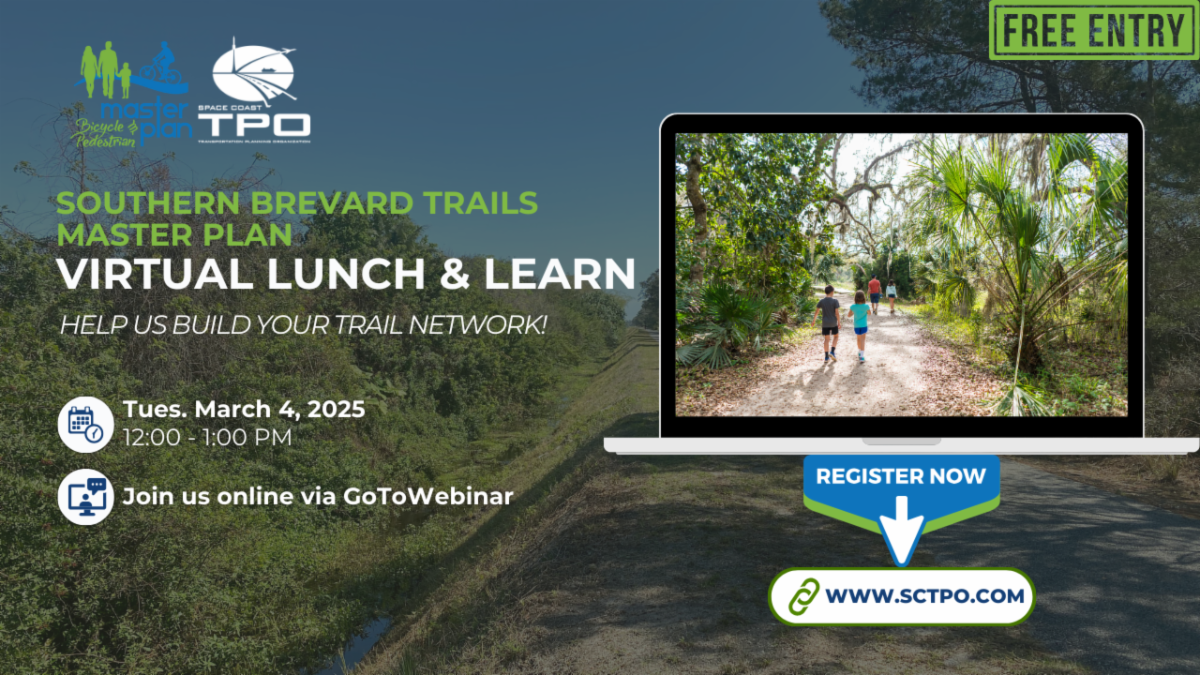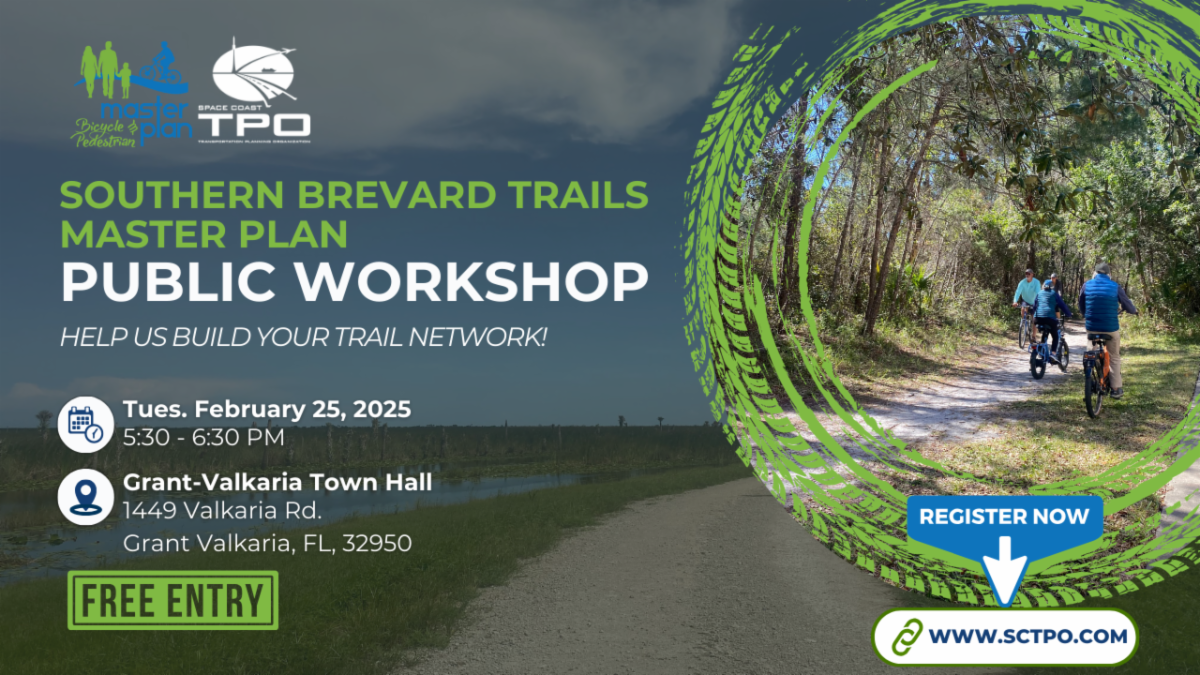 VIERA, FLA –The Space Coast Transportation Planning Organization (SCTPO)invites the public to participate in two exciting engagement opportunities for the Southern Brevard Trails Master Plan. These events will help define a connected and vibrant trail network that enhances outdoor recreation, links communities, and improves transportation options for everyone. Whether you’re an avid cyclist, a weekend hiker, or someone who simply enjoys exploring, your voice matters.